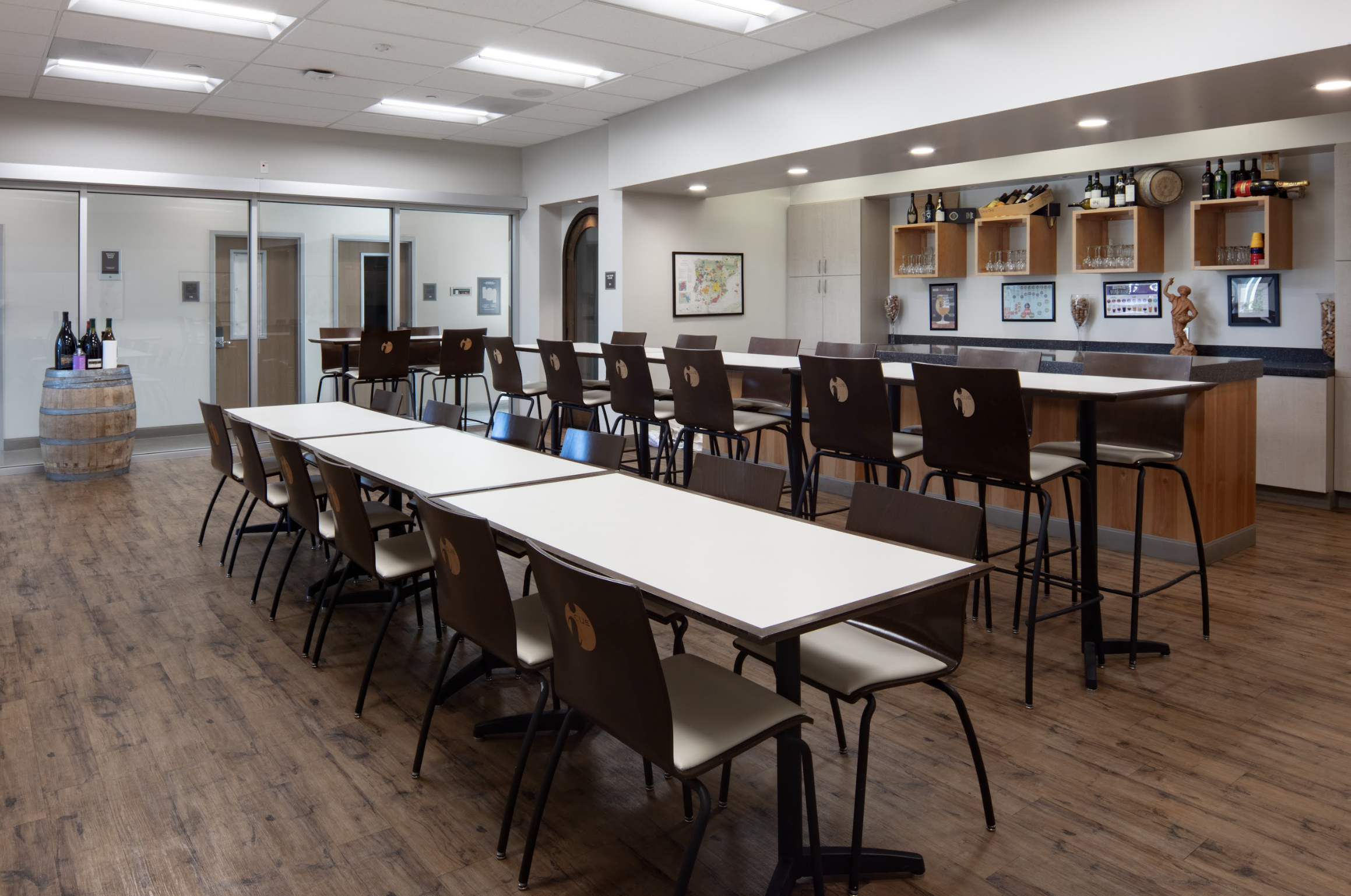 Organized around the main dining room, 10,000 square feet of wine study lab, garde manger kitchen, savory kitchen, demonstration kitchen, culinary lab and sweets kitchen, serve educational as well as social functions.