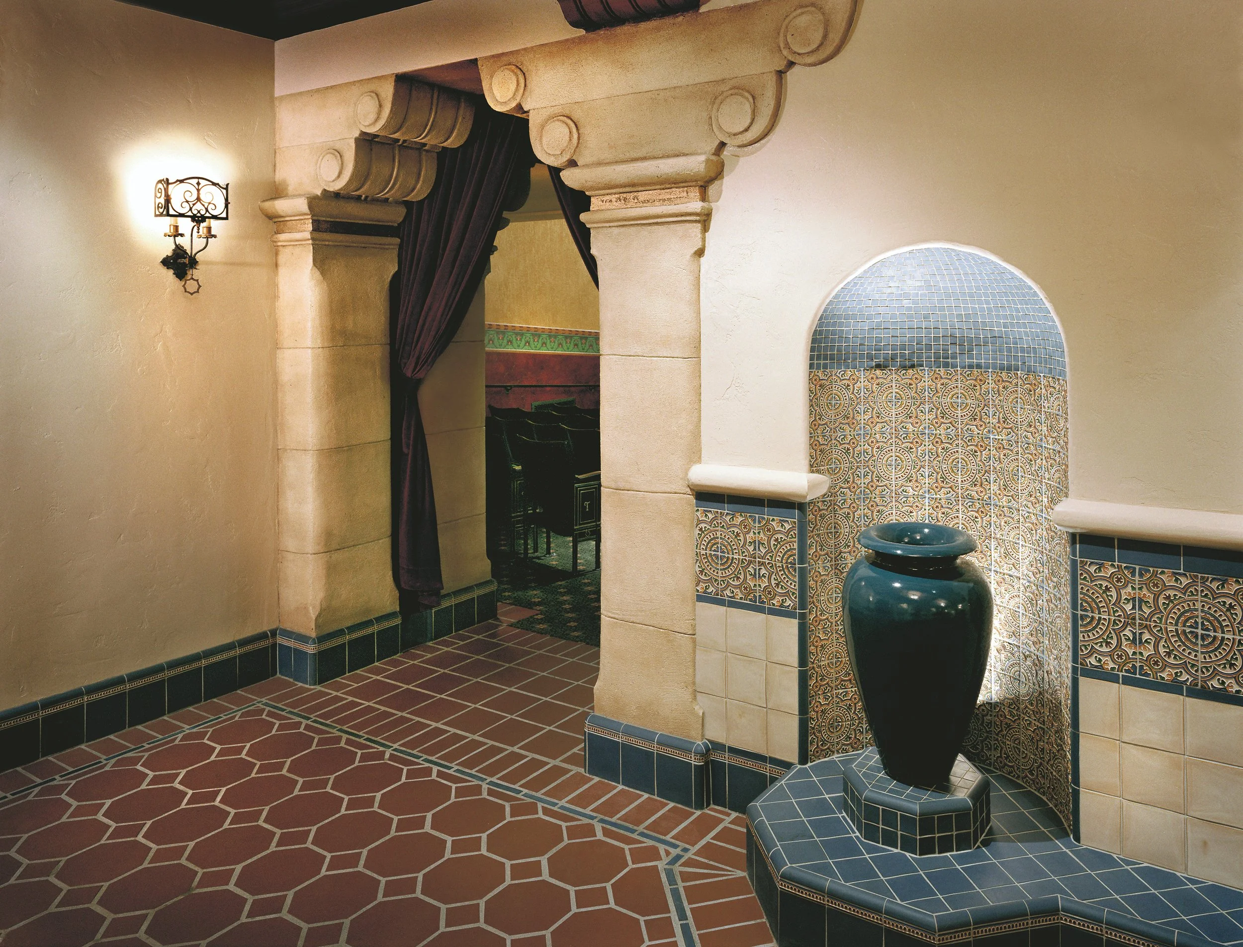 A newly sloped concrete floor provides full ADA accessibility and a lift to the stage was included that did not interrupt any of the original decorative elements. A new tiled foyer was carved out of the back of the original auditorium to include ticket booths and a central gathering area. The selection of tile at the new foyer was sensitive to the existing historic tiles used throughout the campus that are listed with the Tile Heritage Foundation. Refurbishment of the original wood theatre seats included adding upholstery, and refinishing the wood and metal components.